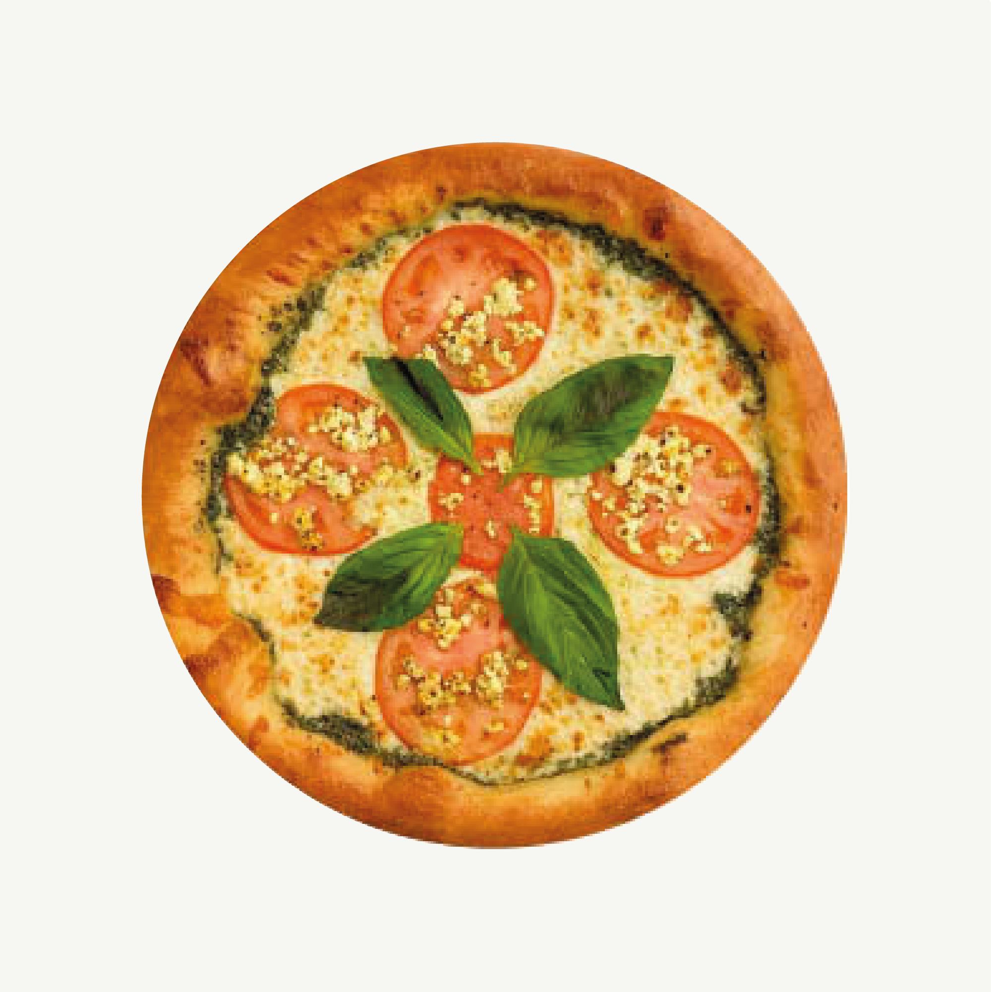 Pesto, mozzarella fondante, fromage de chèvre, tomates juteuses et basilic frais se combinent pour une pizza pleine de saveurs et d’authenticité.
